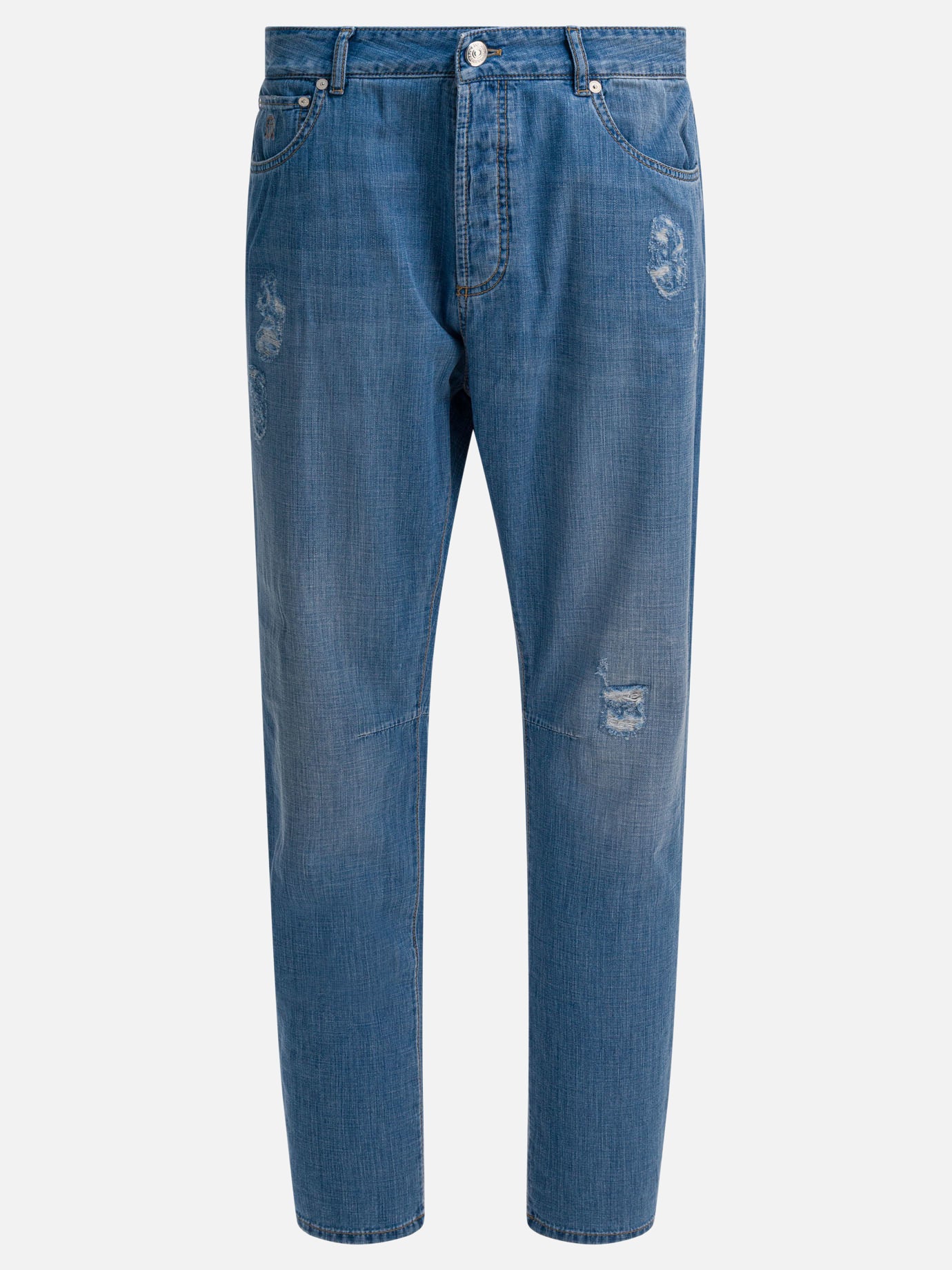 Brunello Cucinelli five-pocket leisure-fit jeans in lightweight Japanese cotton denim. The breaks present along the leg are handmade and each garment features slightly different details. The structure provides an ergonomic silhouette with a soft pelvis and tapered leg. The dyeing process carried out on the finished garment generates tonal variations that are particularly visible on edges and seams. Metal button closure.