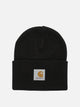 Carhartt WIP "Acrylic Watch" cap, featuring a ribbed knit acrylic fabric construction. The profile is basic, with a fitted silhouette that conforms to the shape of the head. The turned-up hem integrates a fabric label with Carhartt WIP logo applied to the front. Stretch material ensures a versatile and stable fit during use. Compact construction ensures consistent thermal comfort.