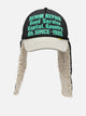 Kapital "Denim Repair Service Lumber" trucker hat, made with ear flaps made of boa material. The classic six-panel design includes a contoured visor and back mesh, which facilitates ventilation. The integrated earmuffs feature a different design on each side, with a print on the left side and mesh on the right side. Buttons attached to the earmuffs allow for adjustment by attaching them above the head or under the chin.
