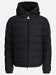 Moncler "Laveraet" short down jacket, constructed with polyester outer shell and lining and inner padding. The construction features adjustable hood with logo detail straps, front zipper closure and side zipper pockets. The bottom of the garment is adjustable via drawstring. The regular cut follows a boxy silhouette with fitted shoulders and chest, emphasizing a compact and defined silhouette.