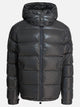 Moncler "Maya" Down Jacket. The padded jacket features a glossy laqué nylon construction with boudin quilting. The silhouette is short, with fitted shoulders and chest and boxy waist. The hood is removable and adjustable, while the front closure is with a double-slider zipper. The garment bottom has an adjustable drawstring, and the left sleeve is finished with a flap patch pocket.