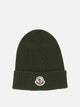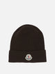 Moncler wool cap, made of extra fine wool yarn with ribbed knitting. The construction features a fitted silhouette and structured lapels. The cap is finished with an applied Moncler logo patch placed frontally on the lapel. Fineness 7 ensures compactness and regularity of the knit. Workmanship and materials enhance the linear and essential structure of the model.