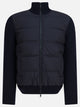 Moncler zippered wool hoodie made of medium-weight knit with a ribbed construction. The front features integrated down filling that gives a defined silhouette and more thermal insulation. The construction features an adjustable hood, full-length zipper front closure, long sleeves and side pockets with snap buttons for added functionality.