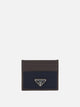 Prada's Re-Nylon and saffiano card holder, constructed through the union of two of the brand's distinctive materials. The surface alternates Re-Nylon panels and cross-grained saffiano leather details, ensuring a compact and geometric structure. The rectangular silhouette contains six card slots and an interior pocket, embellished with triangular enameled metal logo. The interior is lined with moiré and leather lining, with a contrasting finish.