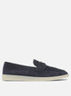 Prada suede loafers made with suede upper and leather lining. The construction features a pinch-stitched tray that defines the upper structure. The silhouette is linear with a low profile. The front detail includes enameled metal triangle logo applied on a strap. The sole is made of lightweight rubber, while the removable footbed is covered in leather.