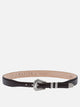 Adriano Meneghetti leather "Palladium" belt, constructed of full-grain crocodile-printed calfskin. The silhouette maintains a linear and rigid structure, with sharp profiles and uniform thickness. The strap is articulated in a continuous, regular band, interrupted by the rectangular solid brass buckle with English silver plating, integrated through a hand-sewn loop. The surface features a raised, crocodile-effect texture.