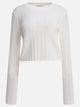 Loulou Studio's knit "Tinos" crew-neck sweater features a cropped silhouette with a perforated finish. The construction incorporates long sleeves and a minimalist profile without additional detailing. Made from a mixed synthetic fabric, it wears a fabrication that highlights the semi-transparent texture. The absence of decorative elements maintains the linear structure and clean cut, suitable for layering or worn individually.