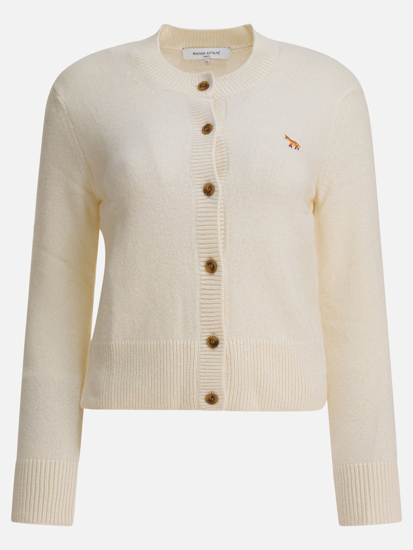 Maison Kitsuné "Baby Fox" cardigan made from lambswool. The structure features a compact weave and a fitted silhouette. The front features a thread-embroidered patch, applied in contrast on the chest. The construction integrates long sleeves, uniform knitting and edges finished with elastic ribbing. Central button closure matches the overall construction.