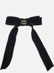 Miu Miu "Bow" hairclip, featuring a leather structure defined by a bow silhouette. The product features a compact construction with velvet lining and applied metal details on the front. The internal structure integrates a metal clip positioned at the back, developed to ensure stability and hold. Front element with contrasting applied metal lettering logo.