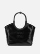 Miu Miu "Ivy" handbag made of calfskin leather with a smooth surface and defined texture. The silhouette features clean lines and a rigid profile, with leather handles sewn on top and a front-applied logo. The shoulder strap, also made of leather, is adjustable and detachable. The interior is lined in cotton gabardine, organized with double zippered pockets and gold-tone metallic details.