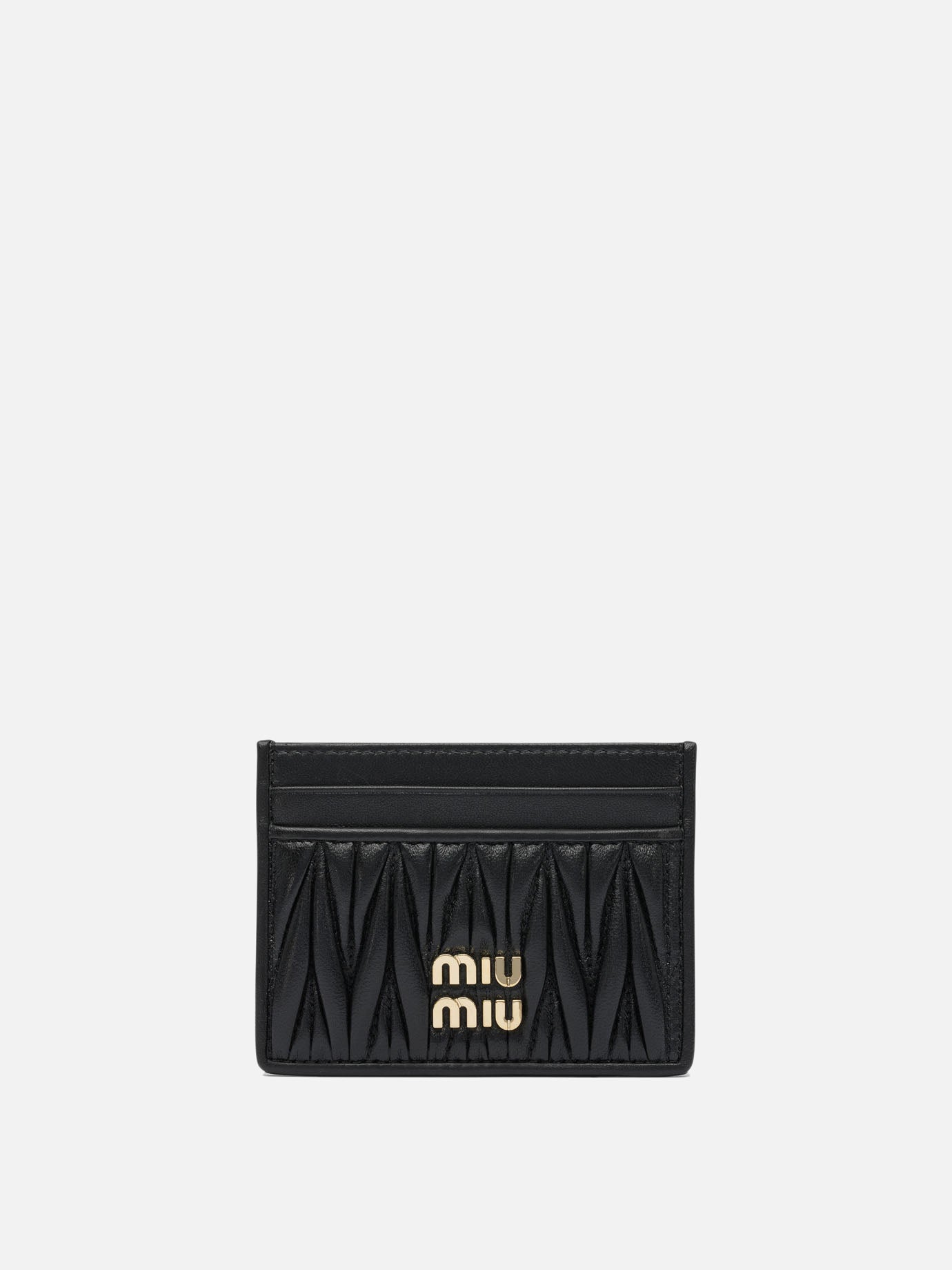 Miu Miu matelassé nappa leather card holder, constructed of matelassé-effect worked leather with a compact silhouette and simple lines. The structure integrates six card slots, organized in parallel rows, designed to distinguish and hold essential cards and documents. The outer surface features a vertical metal lettering logo applied in relief. The interior is finished with moiré lining, chosen for strength and uniformity.