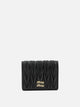 Miu Miu matelassé nappa leather wallet, constructed from leather worked with a three-dimensional pattern, features a compact silhouette and rigid structure. The product integrates a snap-button closure, finished edges and embossed lettering logo applied on the surface. The interior is organized with multiplicity of compartments designed to accommodate banknotes, cards and coins. The interior lining is made of moiré fabric.
