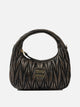Miu Miu "Wander" handbag, made of matelassé nappa leather, features a soft and flexible structure with a three-dimensional effect achieved through embossing. The silhouette follows the hobo line, featuring a top zipper closure and visible metallic details. The removable and adjustable leather shoulder strap allows for differentiated wearability. Inside, cotton satin lining lends a smooth and compact surface.