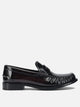 Prada brushed leather moccasins with one-piece construction and essential lines. The upper is made of calfskin leather, finished with mirror work and clean structural details. The silhouette features a squared profile, interrupted by the central leather-applied horsebit. The handcrafted assembly defines regular volume and stable geometry. The sole is made of compact rubber with regular transitions and one-piece profile.