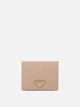 Prada Saffiano leather wallet constructed with a textured surface and linear stitching. The silhouette is compact with a snap-button closure. The interior features a banknote section, three card slots, two interior pockets and a flap coin purse. The rectangular shape provides organization for cards and cash. Enameled metal triangle logo is applied to the front. Interior moiré and Saffiano leather lining.