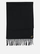 Prada silk and cashmere scarf features a soft, lightweight texture. The construction includes a thin fringed finish applied to the edges. The rectangular design allows for a versatile fit while keeping the structure minimal and free of exposed seams on the main body. A shiny metal triangle with gold logo is prominently applied to one of the corners.