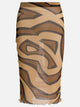 Pucci "Labirinto" skirt made of lightweight semi-transparent stretch tulle with all-over Labirinto pattern. The model features a midi structure with a sheath line, characterized by an elastic band inserted at the waist for added practicality. The hem is finished with micro ruffles that add relief to the essential silhouette. Each garment features a unique print arrangement due to fabric placement.