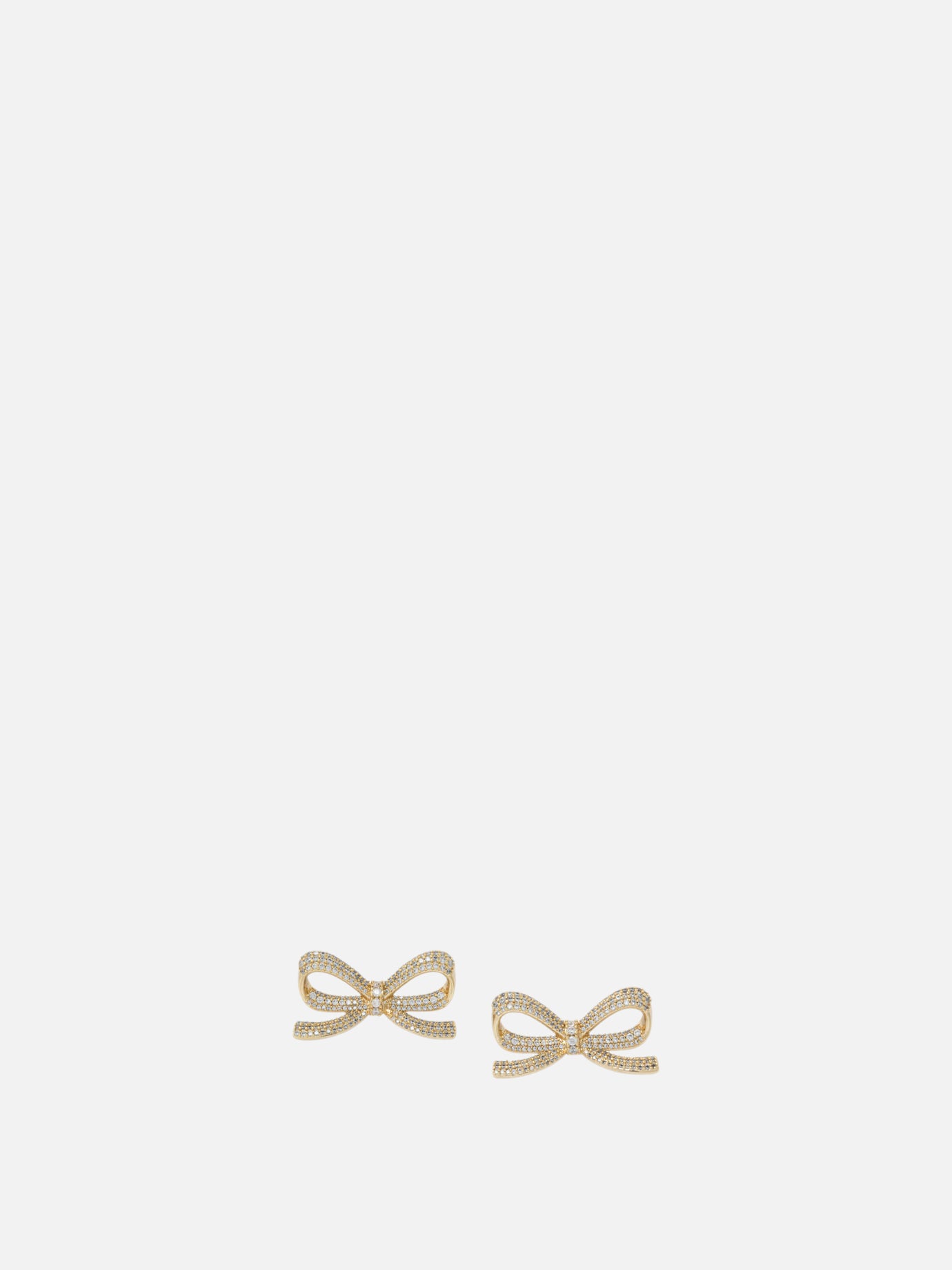 Self-portrait bow and crystal earrings made with a gold-plated brass frame and crystal embellishments applied to the front surface. The shape recalls a three-dimensional bow with marked lines. The construction includes a pin fastening system on the back to ensure stability of the earring during use. Machined surfaces and symmetrical arrangement of the elements define the silhouette.