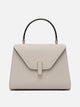 Valextra "Iside" mini handbag, constructed of Millepunte calfskin with compact structure and hard surfaces. The geometric silhouette highlights sharp lines and black lacquered hand-applied edging. The opening is regulated by a rectangular gold-tone metal clasp, finished with a leather insert. The adjustable and removable shoulder strap allows for various modes of carrying. The interior is minimal and maintains a defined shape.
